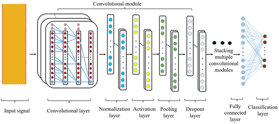 A CNN is an evolved form of artificial neural networks, currently widely used in image processing and fault diagnosis. A typical convolutional neural network structure is generally a multi-layer feedforward neural network composed of an input layer, convolutional layer, and output layer [2]. The convolutional layer typically needs to be used in conjunction with various functional layers, such as pooling layers, activation layers, normalization layers, and dropout layers, to enhance the performance of the convolutional module [28]. A deep convolutional network structure is formed by stacking multiple convolutional modules, with its complete structure shown in Figure 3. Compared to traditional artificial neural networks, the convolutional layer of a CNN has the characteristics of weight sharing and local connections, which significantly reduces the number of model parameters and lowers the difficulty of training the model. A CNN model with multiple hidden layers can automatically extract multiple features from the input signal, where the lower hidden layers learn the generalized features of the input signal, and the higher hidden layers can obtain more abstract, high-dimensional features through the abstraction and extraction of lower-level features, enabling more precise classification tasks.