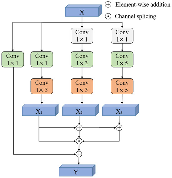 Here, X1, X2, and X3 represent the feature vectors extracted by different branches, the symbol ∗ denotes the convolution operation, C1×1, C1×3, and C1×5 represent conventional convolutions, and Df=1, Df=3, and Df=5 represent dilated convolutions.
