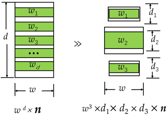 In this study, to improve the efficiency of hyperparameter tuning and enhance the model’s performance, Bayesian optimization is utilized to optimize the architecture hyperparameters and training hyperparameters of the model. To facilitate the optimization of architecture hyperparameters, the model’s feature extraction layers are divided into a three-stage architecture based on the characteristics of the features extracted by convolutional networks. The number of convolutional blocks within each structure is an adjustable parameter, and each convolutional block employs the same number of convolutional kernels, which is also an optimizable parameter. The number of layers within each convolutional block is fixed. The optimization range for each architecture hyperparameter is determined by the experience, the characteristics of the model, and the available computer hardware resources. The maximum number of layers for the model is set as d and the maximum allowed width for each layer as w. The maximum number of layers for each stage of the three-stage structure is denoted as d1, d2, and d3, with the maximum allowed width for each structure also being w. The number of combinations for training hyperparameter optimization is n. The comparison of computational complexity between the two architectures is shown in Figure 7. It can be observed that the number of hyperparameters has been reduced from (d + 1) dimensions to six dimensions, comparing the parameter amount of a conventional model with the three-stage structure with that of a conventional model structure, which makes the automated hyperparameter optimization possible for the model. In addition, the three-stage structure ensures that the model possesses sufficient flexibility and the ability to represent fault features.