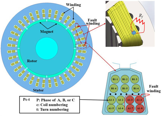 In the fault model of ITSCs in PMSMs, determining the parameters for the stator winding’s self-inductance and mutual inductance is the most complex part. This complexity arises from the changes in the magnetic field caused by the presence of the ITSC fault. The stator winding of a motor is typically composed of multiple coils, as shown in Figure 2. For each coil within a given phase winding, it is necessary to separately discuss the coil’s self-inductance, the mutual inductance between this coil and other coils within the same phase winding, and the mutual inductance between this coil and different coils in the rest of the phase windings.