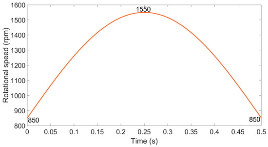 It can be seen from Table 2 that there are 10 different operating conditions in the test process, each generated by combinations of five speeds and two torques. The two load torques are both constant, while among the five speeds, four are constant and one represents an acceleration and deceleration condition. The dynamic speed variation ranges from 850 rpm to 1550 rpm and then back to 850 rpm, as shown in Figure 11. For each distinct fault condition of the motor, ITSC fault tests are conducted under the aforementioned 10 conditions. The Yokogawa DL850EA oscilloscope is used to record the three-phase current, with a sampling frequency of 1 MHz. The data sampling duration for the fault motor under each operating condition is 10 s. The entire data collection process employs a field-oriented control (FOC) strategy using the VFD037C23A inverter, operating at the switching frequency of 15 kHz, with the auxiliary test motor using speed closed-loop control and the tested motor using current closed-loop control.