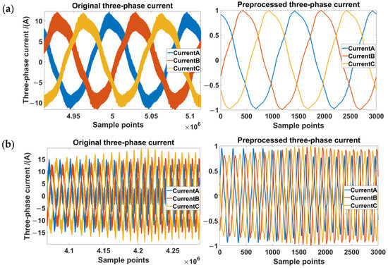 Comparison of three-phase current signals before and after data preprocessing. The left side of the figure shows the original signal, while the right side shows the preprocessed signal. (a) The three-phase current signals are collected under constant operating conditions. (b) The three-phase current signals are collected under dynamic operating conditions.