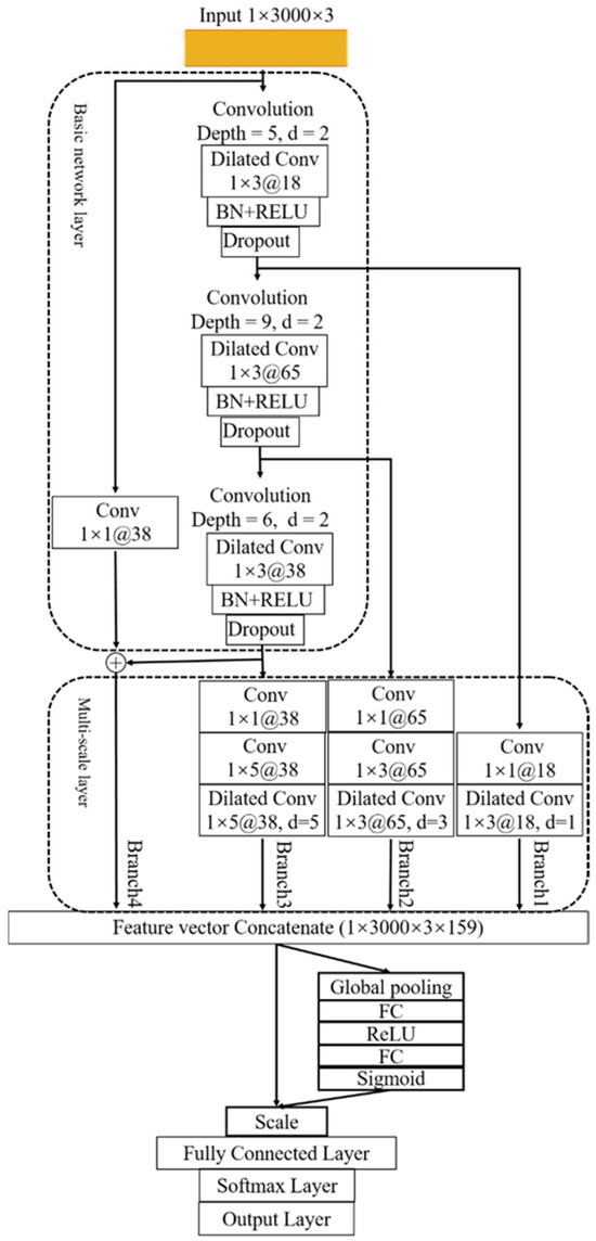 From the structure of the Inception module, it can be seen that the residual network can serve as a branch of the multi-scale parallel structure connected to this module. Therefore, after the input information passes through this module, the output feature vector not only contains features extracted by dilated convolutions with different kernel sizes and dilation factors but also includes features extracted by conventional convolutions with different kernel sizes. This gives the model a richer ability to represent multi-scale features.