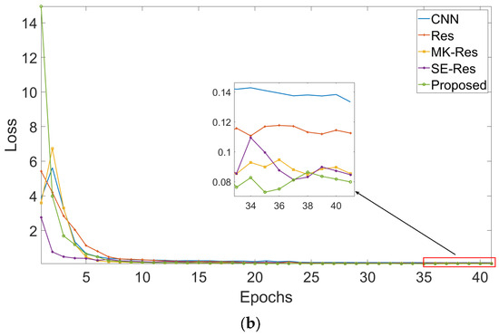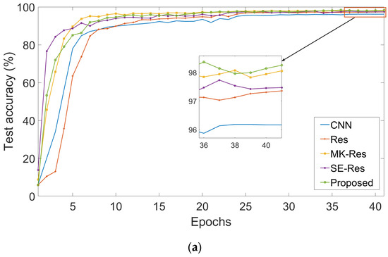 Figure 14a and Table 5 compare the test accuracy trends of the five models as training epochs progress. It can be seen that, compared to the CNN model, all four improved models exhibit varying extends of enhancement in the final test accuracy. The final test accuracy of the CNN model is 96.16%. The final test accuracy of the Res model is 97.35%, which represents an improvement of 1.19% over the CNN model. The MK-Res model achieves a final test accuracy of 98.06%, improving by 1.90% compared to the CNN model. The SE-Res model has a final test accuracy of 97.47%, an increase of 1.31% over the CNN model. The proposed model reaches a final validation accuracy of 98.25%, marking an improvement of 2.09% compared to the CNN model.