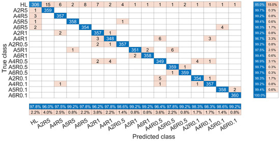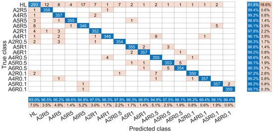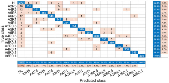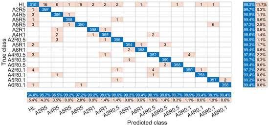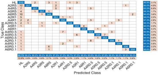 To comprehensively compare the performance of the proposed model with the four other models, the confusion matrices of the five models on the test dataset are compared. The confusion matrices for the five models are shown in Figure 15, Figure 16, Figure 17, Figure 18 and Figure 19. The leftmost labels of the confusion matrix represent the actual severity of ITSC faults contained in the test dataset, categorized into 17 types, arranged in ascending order according to the fault severity calculated using Equation (18). According to the definitions of precision and recall, the precision for each label is derived from the ratio of the number of samples in the diagonal to the total number of samples in that column, as shown in the row vector at the bottom of the confusion matrix. The recall for each label is determined by the ratio of the number of samples in the diagonal to the total number of samples in that row, as indicated by the column vector on the right side of the confusion matrix. The classification accuracy of the models is calculated as the ratio of the number of correctly classified samples on the diagonal to the total number of samples in the test dataset.