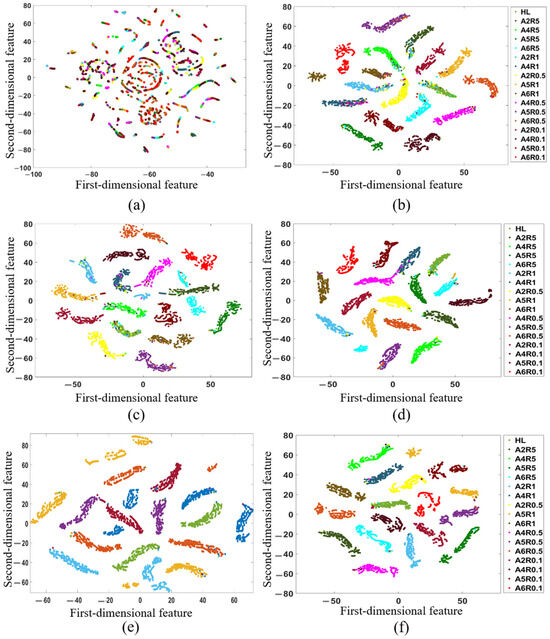 Through a comprehensive analysis of the five ITSC fault diagnosis models, it is evident that the proposed model exhibits the best performance in terms of the final test accuracy and stability. In the F1 scores across 17 different fault severity labels, the proposed model demonstrates overall superior performance, making it the best-performing model among the five. To validate the feature learning capability of the proposed model, the t-distribution stochastic neighbor-embedding algorithm (T-SNE) was used to visualize the features from the final output layer of the ITSC fault diagnosis model, and the results were compared with the other four models. The two-dimensional visualization results are shown in Figure 20. From the figure, it can be observed that the feature map contains 17 colors, each corresponding to a specific fault severity label, with each point representing a data sample. Figure 20a shows the feature distribution of the input layers of each model. It is apparent that the feature distribution of the input data is chaotic, with significant overlap among samples of different colors, making it difficult to discern the fault severity of the corresponding samples in the dataset based solely on the input data. Figure 20b–f display the feature distribution maps of the classification layers for the CNN model, Res model, MK-Res model, SE-Res model, and the proposed model, respectively. From these figures, it can be seen that after feature extraction by the model, the samples within the same ITSC fault severity labels exhibit good intra-class clustering characteristics. The proposed ITSC fault diagnosis model has the fewest misclassified sample points compared to the other four models. Additionally, the boundaries between different ITSC fault labels are clear and more distant, resulting in better separation characteristics among different categories. Thus, the proposed model demonstrates superior feature learning and discrimination capabilities.