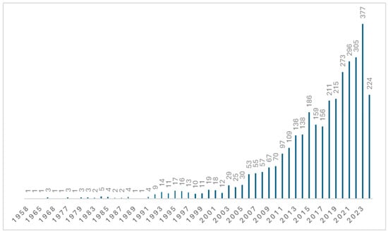 To carry out the analysis, the first step is choosing four key aspects that mark the success of the analysis and systematization of the information [], such as 1. the type of studies to be used (in our case, we focused only on indexed scientific articles, because we were sure that they passed a review process, and, therefore, in our opinion, they had the maximum scientific validity) []; 2. the database from which information is extracted (In our case, we chose the Social Sciences Citation Index (SSCI) of the Web of Science (WoS). The choice of this database over others such as SCOPUS, which is also widely used in economics and business studies [,], was due to the fact that WoS allows a longer time for analysis [] and is considered the priority indicator when evaluating the quality and impact of scientific production) []; 3. the unit of analysis to be used for the creation and analysis of scientific maps (i.e., the keywords). Thus, the analysis of the co-occurrence of keywords allows the identification of the basic themes in a scientific field by showing its conceptual and cognitive aspects [,]. 4. In the search strategy in this case, the concepts of “Rural Economy” and “Family firms” were selected, and the search was carried out by topic, from which we selected the articles that contained these concepts in the title, abstract, and keywords []. In this way, we obtained a total of 3641 articles published from 1958 to 2024.