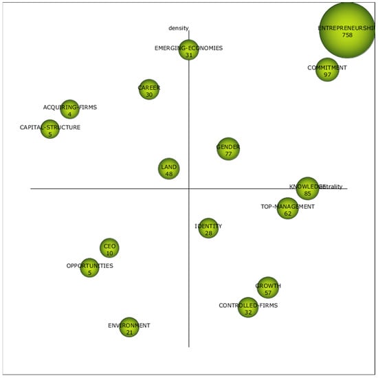On the upper-right side, the driving topics are shown, which are the topics that had the strongest relationship with the rest and that were more developed: entrepreneurship, gender, and commitment. These are very important topics that allowed the formation of the scientific field. The most prominent for the number of documents, as well as for its greater centrality and density, is entrepreneurship.