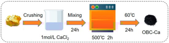 The citrus peels utilized in the experiment came from the citrus cultivation demonstration base in Yu Long River, Guilin, Guangxi. The citrus peels were dried in an oven at 60 °C for 24 h. After drying, the peels were pulverized using a grinder, and the resulting powder was passed through a 60-mesh sieve. It was then combined with 1 mol·L−1 CaCl2 in a 1:10 ratio for 24 h, followed by filtration and drying at 60 °C for another 24 h. The dry powder was carbonized at 500 °C for 2 h to produce calcium-modified biochar (OBC-Ca) (Figure 1). The basic elemental composition, pH, and yield of OBC-Ca are shown in Table S2.