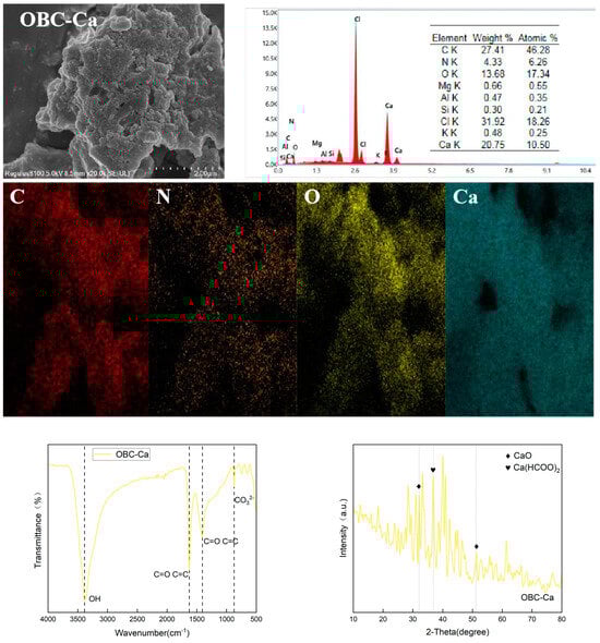 The broad absorption peak of OBC-Ca at 3387 cm−1 corresponds to the -OH stretching vibration, while C=C and C=O vibrations are responsible for the peaks at 1626 cm−1 and 1406 cm−1, respectively [20]. The peak at 873 cm−1 is primarily associated with the out-of-plane bending mode of CO₃2− (Figure 2). Loading calcium onto citrus peel biochar enhanced the intensity of the -OH peaks and created additional adsorption sites. The peak observed at 36.84° for OBC-Ca is related to Ca(HCOO)₂, while those at 32.1° and 51.2° correspond to CaO [21] (Figure 2). These findings indicate that calcium is incorporated into citrus peel biochar as both CaO and Ca(HCOO)₂.