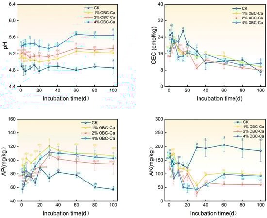 The use of OBC-Ca considerably raised the level of quick-acting phosphorus (p < 0.05), supporting the findings of Liu [27] and Zhang [28]. The increase in readily available phosphorus can be attributed to three factors: the presence of phosphorus in biochar itself, which directly enhances soil effective phosphorus levels [29]. Biochar also increases soil pH and alters cation activity, which can reduce phosphorus adsorption or promote phosphorus desorption, thereby increasing phosphorus availability [30]. Furthermore, the application of biochar to the soil modifies the microbial environment, enhancing the soil’s phosphorus fixation capacity [31]. The decrease in readily available phosphorus content with prolonged incubation time was primarily attributed to the reduction in effective phosphorus resulting from soil phosphorus fixation [32]. The application of alkaline biochar to acidic soils resulted in improved phosphorus bioavailability [33], and differences in the effect of OBC-Ca application on quick-acting phosphorus content in soils could be attributed to inconsistencies in the chemical formula and surface features of the biochar loads.