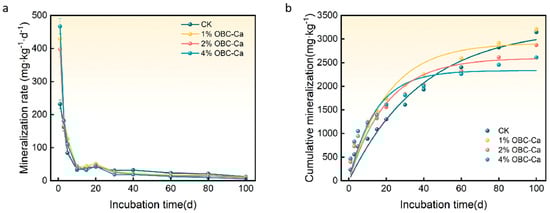 Figure 4a shows how OBC-Ca affects the rate of soil organic carbon mineralization. The rate of organic carbon mineralization in the soil is significantly affected by the application of OBC-Ca. The CO2 emission rate declined in every therapy from the 1st to the 10th day of incubation, then increased between days 10 and 20, and decreased as the incubation duration increased after 20 days in all treatments. The CO2 emission rate dropped by 9.20%, 20.69%, and 52.30% after applying 1%, 2%, and 4% OBC-Ca, respectively.