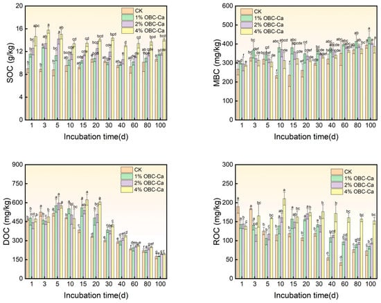 Differences between treatments became significant (p < 0.05) as incubation time increased, with the greatest increase in SOC content observed at higher percentages of biochar application (Figure 5). At the conclusion of the incubation times, 1% OBC-Ca was 1.08-fold, 2% was 1.09-fold, and 4% was 1.32-fold CK. The addition of OBC-Ca to citrus crop soils led to significant (p < 0.05) alterations in MBC levels. MBC content in soil grew continuously from the 20th to the 100th day of incubation after OBC-Ca was sprayed, reaching the summit on the 100th day. At 100 days, 1% OBC-Ca climbed to 10.46%, 2% grew by 2.63%, and 4% reduced by 1.56% when contrasted with CK. Putting OBC-Ca to citrus orchard soils resulted in significant changes (p < 0.05) in soil DOC levels. The administration of OBC-Ca resulted in a general rise in DOC content from day 1 to day 15 of incubation, followed by an overall declining trend from day 15 to day 100 of incubation, with DOC at the conclusion of incubation greater than CK at each application rate. In comparison to CK, the DOC content at 100 days increased by 0.48% (1% OBC-Ca) and 9.84% (2% OBC-Ca), respectively, as opposed to CK, 11.67% (4% OBC-Ca). The use of OBC-Ca in the soil considerably changed the ROC content (p < 0.05). After applying OBC-Ca to the land, the ROC steadily declined from days 1 to 5, climbed from day 10 to day 20 of incubation, and then decreased again from day 20 to day 60 of incubation. At the conclusion of the incubation period, 1% OBC-Ca grew by 16.41%, 2% OBC-Ca climbed by 28.91%, and 4% OBC-Ca showed a remarkable increase of 108.59% versus the control group (CK).