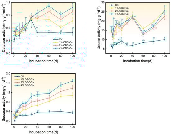 Changes in soil enzyme activities after application of calcium-modified biochar. Different lowercase letters represent significant differences (p < 0.05).