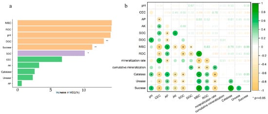 A randomized forest experiment was conducted to investigate the effects of physicochemical properties, active fractions of organic carbon, and enzyme activities on soil organic carbon mineralization. The results showed that MBC, ROC, DOC, and sucrase activities were important factors affecting the amount of loamy organic carbon mineralization (Figure 7a).