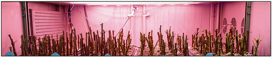 The rated power of the blue-purple light is 50 W, and the wavelength adjustment range of the light source spans from 400 nm to 475 nm. The power of the light source under the light environment of the non-blue-purple lamp is also set to 50 W. The relative humidity of the experimental environment is 95%. The temperature of the experimental environment is 22 °C. The observation angle set by the camera aligns with the image acquisition system depicted in Figure 13, ensuring that the number of cuttings observed within the camera’s field of view meets the prediction requirements of the model. The controller consists of Nvidia Jetson Xavier nx modules, with 16 GB of RAM and the ability to run the neural network model. The fog droplet generation device is an ultrasonic atomizer that utilizes electronic high-frequency oscillation at a frequency of 1.7 MHz to generate water mist by breaking up the structure of liquid water molecules through high-frequency resonance of ceramic atomization plates. The negative pressure fan at the droplet outlet transports the water mist to the surface of the cuttings at a speed of 3.2 m/s, where the droplets deposit to form a water film for moisture retention. A total of 300 cuttings of apple rootstocks were subjected to hardwood cutting experiments to serve as test subjects for evaluating the efficiency of the humidification system.