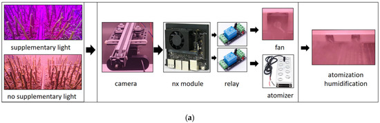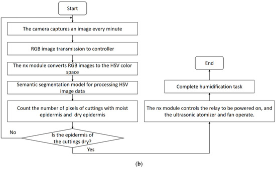 As shown in Figure 13a, the humidifying control system for inserting ears consists of a camera, module, relay, fan, and atomizer. Figure 13b shows the software design of the humidification control system for cuttings in this study. The camera collects images of the inserted cutting epidermis image every minute, and the image data are input into the neural network model of the module for prediction. The prediction results of the insertion epidermis image serve as the basis for the operation of the fan and atomizer. In the prediction results, the proportion of dry inserted epidermis image pixels to the total number of inserted cuttings pixels is greater than 50%. When the atomized and humidified insertion epidermis image pixels account for more than 90% of the total number of pixels, the fan and atomizer will stop running.