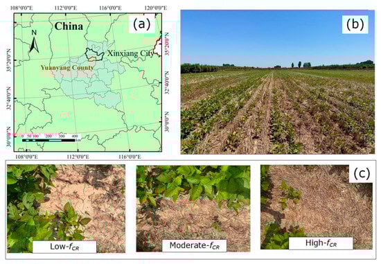 Study area and experimental sites. (a) Location of the study area. (b) Soybean experimental field. (c) Field “crop–crop residue–soil” digital images, fCR (crop residue coverage).