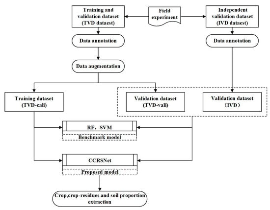 This study focused on a dataset of images featuring crops, crop residue, and soil from various agricultural fields, applying different machine learning and deep learning models for image segmentation. The primary goal was to extract the proportions of each category and compare the models’ performance. The technical workflow, illustrated in Figure 3, consisted of the following four steps: