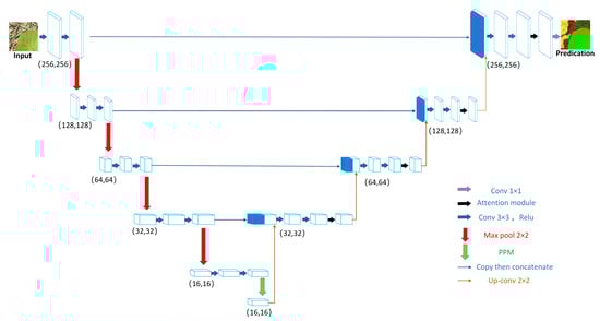 - Pyramid pooling module (PPM): PPM is composed of multiple pooling layers, each using windows of different sizes (including 1 × 1, 2 × 2, 3 × 3, and 6 × 6 pooling windows in this study) to extract contextual information of images at different scales. Subsequently, the pooled information is adjusted to the same size and concatenated through upsampling [].