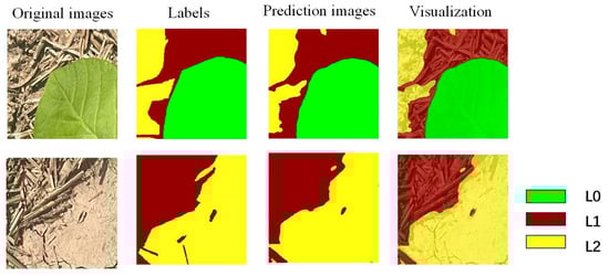 - Data preprocessing: The dataset was manually annotated, categorizing the images into three classes: “soil–crop–crop residue”. Data augmentation techniques, such as rotation and mirroring, were applied to enhance the dataset.