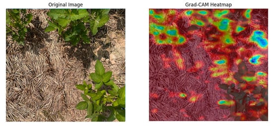 Based on the model’s performance on the TVD and IVD datasets, we ultimately selected the CCRSNet model with VGG16 as the backbone network (TVD dataset: mIoU of 87.84%, PA of 93.70%; IVD dataset: mIoU of 92.73%, PA of 96.23%) to perform “crop–crop residues–soil” image segmentation and proportional extraction for farmland images. Figure 6 shows two randomly selected farmland images, along with their annotation and prediction results, while Figure 7 displays the original farmland images and their corresponding predictions to illustrate the model’s performance under real-world conditions. Figure 8 shows the visual explanations provided by highlighting the image regions that the model considers crucial for a specific prediction through Grad-CAM. It can be seen from the figure that the model pays the highest attention to crop residue. Our results demonstrate that the CCRSNet model, using VGG16 as the backbone, is highly effective in achieving “crop–crop residues–soil” image segmentation for farmland images.
