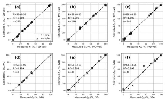 Proportion extraction of crop, crop residues, and soil using digital images and deep learning based on the TVD and IVD datasets. (a) crop (TVD-vali). (b) crop residues (TVD-vali). (c) soil (TVD-vali). (d) crop (IVD). (e) crop residues (IVD). (f) soil (IVD).