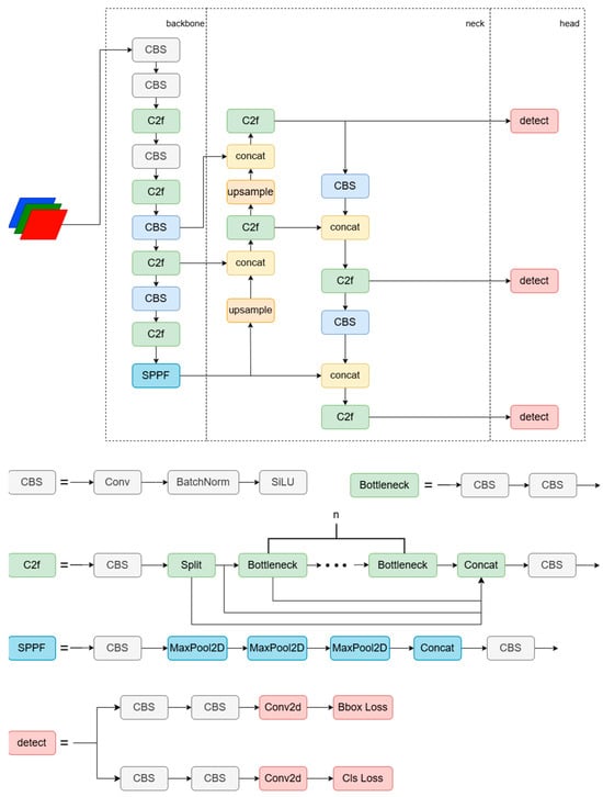 Presently, among the highly adopted object detection approaches in both academic and industrial settings is YOLO. Since Joseph Redmon [] proposed the YOLO framework in 2016, the series has evolved rapidly and has iterated to many versions [,,,,]. One of the greatest strengths of the YOLO family of algorithms is that they can detect objects very quickly while performing well in terms of accuracy. YOLO handles the object detection issue as though it were a regression issue, requiring only a single forward pass from the input image to the output bounding box and category probabilities, making it faster than algorithms that require multiple detections or incremental refinements []. Furthermore, YOLO makes predictions directly on the whole image, rather than generating candidate regions and then classifying them as in the R-CNN family of algorithms, which enables YOLO to effectively manage background information and context while optimizing the extraction of global information from the image. This study builds upon YOLOv8, which consists of three main components. The first part is the “backbone”, which is used to extract characteristic images of wheat pests. In YOLOv8, this part uses DarkNet-53. The “neck”, which is situated in the middle, integrates and enhances features from various stages of the backbone, giving the neural network the ability to fully utilize the feature in the wheat pest dataset. This component is typically implemented using the path aggregation network (PAN) [] or feature pyramid network (FPN) []. The “head” comprises the detection heads of YOLOv8, including multiple convolutional and fully connected layers, and is tasked with final target classification and bounding box regression. Figure 2 illustrates the YOLOv8 model’s structure.