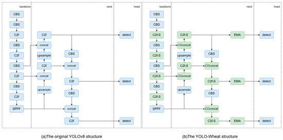 (a) Structure of the original YOLOv8. (b) Structure of YOLO-Wheat: blue background color for unaltered parts, green background color for altered parts (the structure of the improved modules is given in the corresponding introductory chapters).