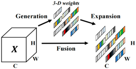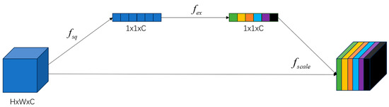 where is the output obtained after the squeeze operation. The first fully connected layer’s weight matrix is denoted by , and the feature matrix of the second fully connected layer is represented as . represents the activation function ReLU [] and represents the sigmoid operation.