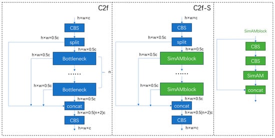 The aforementioned equations demonstrate how the SimAM helps the model focus more on significant neurons by giving them larger weights. In addition, when we are performing the object detection task for wheat pests, it is challenging to help the model better localize to the pest targets because these pest targets are small and dense in the natural environment. By applying SimAM to the neural network, we can assign higher weights to the targets. This, in turn, enhances the network’s performance. Therefore, in YOLO-Wheat, we introduce SimAM in the C2f module to form a new module called C2f-S, whose specific structure is shown in Figure 5.