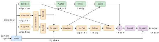 Here, g denotes the number of groups into which the input channels are divided, and X Avg Pool and Y Avg Pool denote horizontal and vertical global pooling along one dimension, respectively []. The EMA module processes the inputs through two branches: one for global pooling and the other for convolutional operations using a 3 × 3 convolutional kernel size. The inputs are first split into g groups by channel. The output features of both branches are then passed through sigmoid and normalization operations and finally merged through a cross-dimensional interaction module. After the final sigmoid, the output features are mapped to enhance or weaken the original input features to obtain the final output. Overall, the core idea of EMA is to retain rich feature information through multi-scale feature processing and efficient computation while dynamically adjusting the weights of feature maps.
