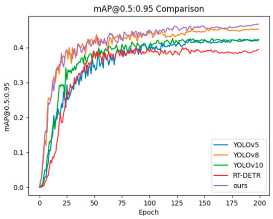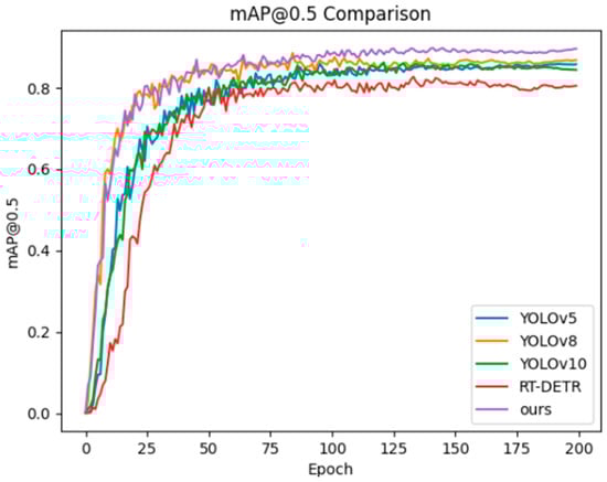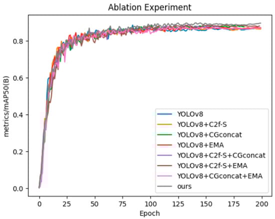 Table 4 indicates that the mAP values are 87.3%, 87.8%, and 87.7% for the YOLOv8 model with the addition of C2f-S, CGconcat, and EMA modules, respectively. Additionally, we observe that integrating multiple modules further enhances the model’s performance, especially when the three improved modules are introduced, which improves the mAP@0.5 and mAP@0.5:0.95 by 2.8% and 1.7%, respectively, on the test set. Figure 12 depicts a graph in which epochs are plotted on the x-axis and mAP@0.5 is plotted on the y-axis, clearly illustrating how each module influences the model performance during the training process. Such results confirm the effectiveness of the three proposed improvement modules in this study. First, a comparison of the training curves in Figure 12 shows that the accuracy of the trained model improves after the introduction of the improvement module, relative to the model before the module was introduced. Second, although many improvement modules enhance model accuracy at the cost of slowing down the convergence speed, the improvement module proposed in this paper improves the model’s performance without reducing the convergence speed after being introduced.