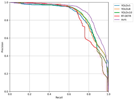 In this paper, the P–R curves for each algorithm are plotted for comparative analysis, as shown in Figure 11, to further demonstrate YOLO-Wheat’s superiority in a more intuitive manner.