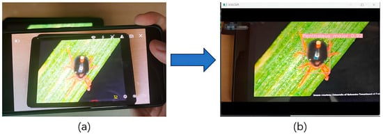 Real-time detection display. (a) Pest monitoring (performed on the Redmi K70). (b) Detection results (performed on the Lenovo Legion Y7000).