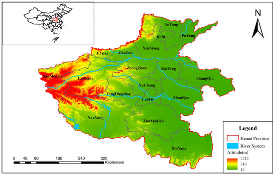 This study focuses on Henan Province as the study area. Henan Province is situated in the middle and lower reaches of the Yellow River (31°23′ N–36°22′ N, 110°21′ E–116°39′ E) in the central-eastern part of China, within the southern region of the North China Plain. The province covers a total area of 16.7 × 104 km2 and is bordered by Shandong Province, Anhui Province, Shaanxi Province, Hebei Province, Shanxi Province, and Hubei Province. It is unique in China, spanning the four major river basins: the Yellow River, Hai River, Huai River, and Yangtze River. Henan Province has seventeen prefecture-level cities and one county-level city directly under provincial jurisdiction (JiYuan City). The specific geographic location of Henan Province is illustrated in Figure 1.