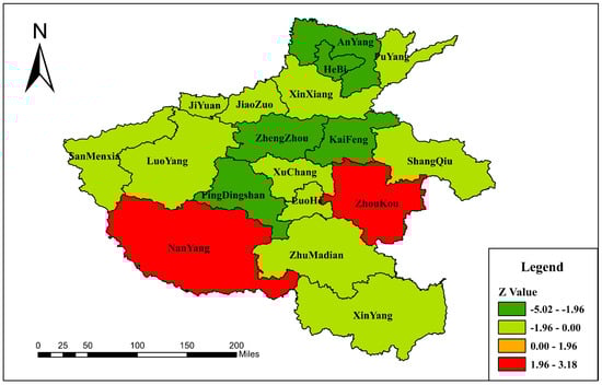 The results of LMDI decomposition indicated that from 1999 to 2022, agricultural water consumption in Henan Province decreased by 2415 million m3. Regarding the direction of impact, the effects of agrometeorological stress, agrometeorological economy, and agricultural cultivation structure all act to inhibit the increase in agricultural water consumption, whereas the effects of agricultural development scale, agricultural irrigation capacity, and agricultural food security act to promote the increase in agricultural water consumption. In terms of intensity, the agrometeorological economic effect has the greatest contribution to changes in agricultural water consumption in Henan Province, amounting to 24.578 billion m3, while the agricultural food security effect has the smallest contribution, with a value of 2.603 billion m3. Overall, the agrometeorological economic effect is the primary factor in reducing agricultural water consumption in Henan Province, while the agricultural development scale effect is the main driver of increased agricultural water consumption. The decomposition effects of agricultural water consumption across various cities and towns in Henan Province are presented in Table 7.