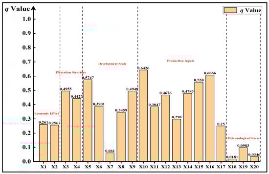 Among these methods, divergence and factor detection are employed to assess the extent to which the spatial divergence of an independent variable factor explains the dependent variable . The result is represented by the value, which has a range of [0, 1]. A larger value signifies a stronger explanation of the dependent variable by the independent variable , whereas a smaller value indicates a weaker explanation. Detailed expressions are provided in Equations (8) and (9).