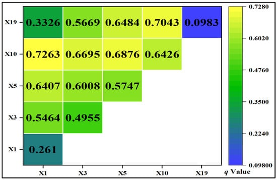 Therefore, this study determined that the principal factors affecting agricultural water consumption in Henan Province are agricultural value added (), sown area of grain crops (), total sown area (), irrigated area (), and average annual temperature (). Interaction detection among these key factors was conducted, as illustrated in Figure 4, revealing that all key factors exhibited two-factor enhancement effects. The highest interaction detection results were observed for irrigated area () and agricultural value added (), with a value of 0.7263, while the lowest results were observed for average annual temperature () and agricultural value added (), with a value of 0.3326.