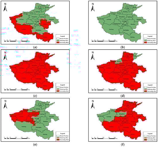 Spatial distribution map of the direction of action of each decomposition variable of agricultural water consumption in Henan Province. (a) Agrometeorological stress effects; (b) Agrometeorological economic effects; (c) Scale effects in agricultural development; (d) Agricultural irrigation capacity effects; (e) Agricultural cropping structure effects; (f) Agricultural food security effects.