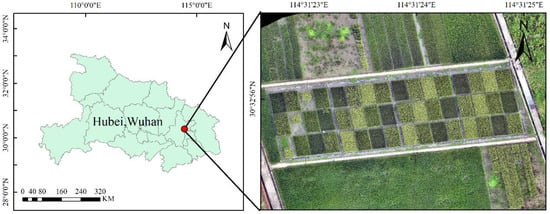 The field experiment area and a map of its location in Wuhan, Hubei. The (left) figure illustrates the location map of Wuhan City in Hubei province, and the (right) diagram depicts the field experiment’s layout.