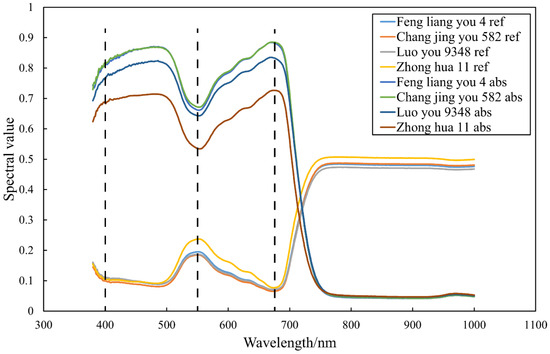 Absorption spectra and reflectance spectra of four varieties of rice under 1 N conditions at 101 days after transplanting (where ref represents reflectance spectra and abs represents absorption spectra).