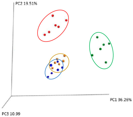 A biplot was also used to visually interpret the variation in microbiota composition across different dietary groups in piglets. The biplot combines the PCA scores of samples and the loadings of key microbial genera on the same plot, providing an integrated view of both sample clustering and microbial contributions. The arrows representing microbial genera indicate both the direction and strength of their association with principal components, highlighting taxa driving treatment-specific shifts.