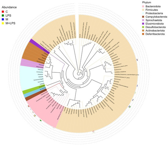 Finally, Desulfobacterota was present in very low abundances across all groups but saw an eightfold increase in the LPS group (p < 0.05), indicating that LPSs promote its growth. Mustard seed meal completely inhibited Desulfobacterota in the M group, while in the M+LPS group its abundance decreased by 60% compared to the LPS group (p < 0.05), further underscoring mustard’s mitigating effects against LPS-induced dysbiosis (Table 2 and Table 3).