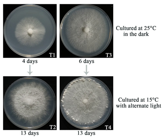 The P. tuoliensis CCMSSC 02607 strain was obtained from the Center for Mushroom Spawn Standards and Control of China (CCMSSC). The CCMSSC02607 strain was punched with a hole punch (φ7 mm), inoculated in PDA medium (15.6 g of potato dextrose agar powder dissolved in 400 mL of distilled water, sterilized at 121 °C for 20 min), and cultured at 25 °C in the dark for 4 days (T1) and 6 days (T3), respectively. Then, two different treatment groups were cultured at 15 °C with alternate light (12 h light, 12 h dark) for 13 days (T2 and T4) (Table 1). Mycelia and primordia were collected and stored at −80 °C after being snap-frozen in liquid nitrogen for subsequent experiments.