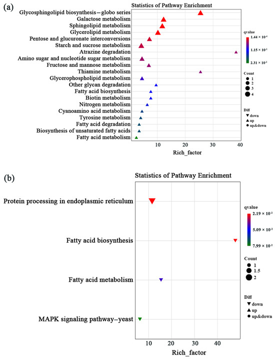 KEGG functional enrichment analysis of DEGs affected by incubation time (T1 vs. T3). (a) KEGG functional enrichment analysis of upregulated DEGs affected by incubation time. (b) KEGG functional enrichment analysis of downregulated DEGs affected by incubation time.