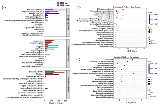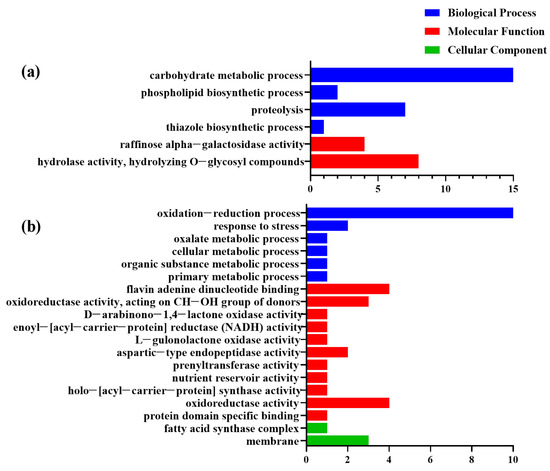 GO analyses showed that the upregulated DEGs were significantly enriched in the biological processes of carbohydrate metabolism, phospholipid biosynthesis, proteolysis, and thiazole biosynthesis and the molecular functions of raffinose alpha-galactosidase activity and hydrolase activity (Figure 3a), whereas downregulated DEGs were related mainly to the biological processes of oxidation-reduction, response to stress, oxalate metabolism, cellular metabolism, organic substance metabolism, and primary metabolism; the molecular functions of flavin adenine dinucleotide binding, oxidoreductase, D-arabinono-1,4-lactone oxidase, enoyl-[acyl-carrier-protein] reductase, L-gulonolactone oxidase, aspartic-type endopeptidase, prenyltransferase, nutrient reservoir, holo-[acyl-carrier-protein] synthase, oxidoreductase, and protein domain-specific binding; and the cellular components of the fatty acid synthase complex and membrane (Figure 3b). The results were similar to those from the KEGG analyses.