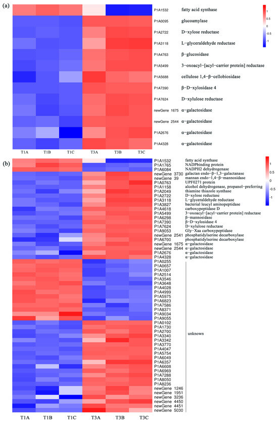 Heatmap analyses demonstrated that among these 13 DEGs enriched significantly in KEGG terms, only one gene coding for fatty acid synthase was significantly downregulated, whereas the other 12 DEGs were significantly upregulated (Figure 4a). A total of 58 DEGs were enriched significantly in GO terms, of which the significantly downregulated genes encoded fatty acid synthase, NADP-binding protein, and NADPH2 dehydrogenase, whereas 20 significantly upregulated genes encoded galactan endo-β-1,3-galactanase, mannan endo-1,4-β-mannosidase, UPF0271 protein, alcohol dehydrogenase, propanol-preferring, thiamine thiazole synthase, D-xylose reductase, L-glyceraldehyde reductase, bacterial leucyl aminopeptidase, carboxypeptidase D, 3-oxoacyl-[acyl-carrier protein] reductase, β-mannosidase, β-D-xylosidase 4, D-xylulose reductase, Gly-Xaa carboxypeptidase, phosphatidylserine decarboxylase, and α-galactosidase (Figure 4b). Some of the key DEGs selected via KEGG analysis were the same as those selected via GO analysis.