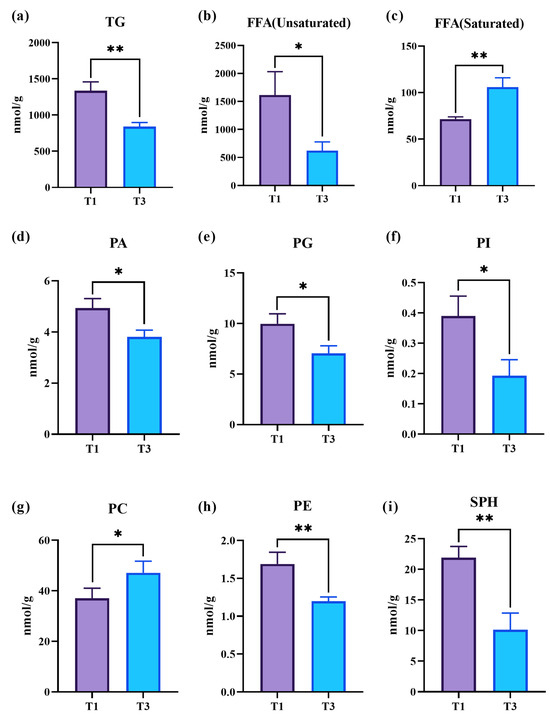 Because transcription analysis revealed that lipid metabolism was most active during the mycelial culture period, the changes in the relevant lipid components during the incubation period were further analyzed. The results showed that the triglycerides (Figure 5a), unsaturated free fatty acids (Figure 5b), sphingosine (Figure 5i), and some types of phospholipids, including phosphatidic acid (Figure 5d), phosphatidylglycerol (Figure 5e), phosphatidylinositol (Figure 5f), and phosphatidylethanolamine (Figure 5h), significantly decreased in T3, as compared to T1. However, the saturated fatty acids and phosphatidylcholine (Figure 5g) significantly increased during the incubation period. The proportion of unsaturated free fatty acids was much greater than that of saturated fatty acids (Figure 5c). Phosphatidylglycerol and phosphatidylcholine were the main components of the phospholipids involved in mycelial growth in the dark.