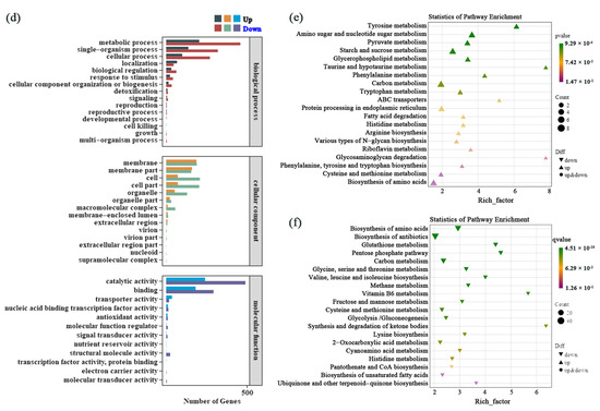Metabolic pathways of mycelia that went through various incubation periods and then stimulation. (a) GO functional enrichment analysis of DEGs identified between T1 and T2. (b) KEGG functional enrichment analysis of upregulated DEGs identified between T1 and T2. (c) KEGG functional enrichment analysis of downregulated DEGs identified between T1 and T2. (d) GO functional enrichment analysis of DEGs identified between T3 and T4. (e) KEGG functional enrichment analysis of upregulated DEGs identified between T3 and T4. (f) KEGG functional enrichment analysis of downregulated DEGs identified between T3 and T4.